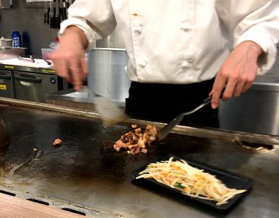 お店のシェフが直接鉄板で料理中!一つ一つを丁寧に焼き上げていきます。