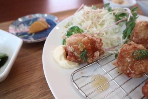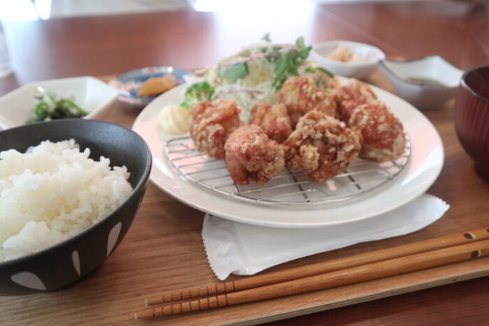 からあげ定食(ネギ塩だれ付)をオーダーしました。お盆一杯に置かれたおかずに感動!