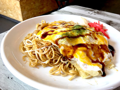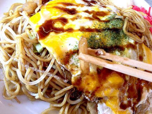 焼きそばの上に大きく乗った卵焼きが特徴!甘辛の焼きそばソースがさらに食欲をそそります。