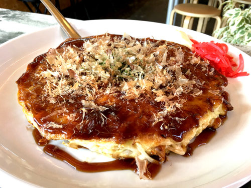熊本では、お好み焼きは固めに両面を焼くタイプが多いですが、こちらはまるでパンケーキかのようにふわっふわなお好み焼きです。しかも実は材料に山芋を一切使用していないそうで、不思議な限り。なぜ山芋無しでこのふわふわになるのかは企業秘密だそうです。