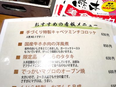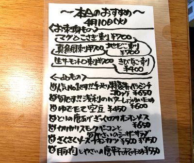 ※お店のメニューに店名通りの「くじらのタタキ」がありますが、現在はかなり入手困難とのことで一時提供休止中となっています。