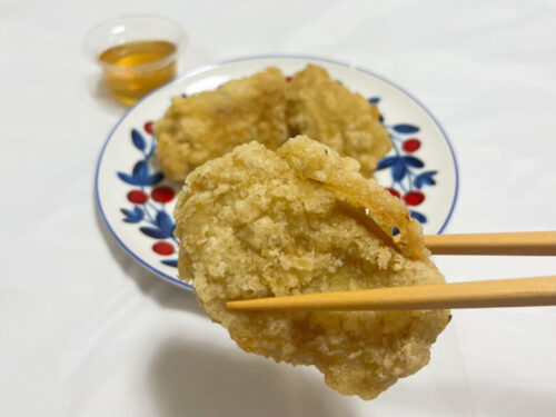 だし唐揚げには国産の若鶏を使用。かつおと昆布だしで味付けされています。