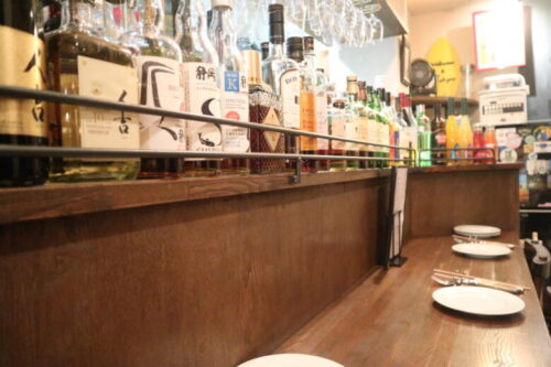 カウンター席を選びました。目の前には色んなお酒がずらり。いつか私のキッチンもこんな風にしたいなという夢があります。(お酒はほどほどに)