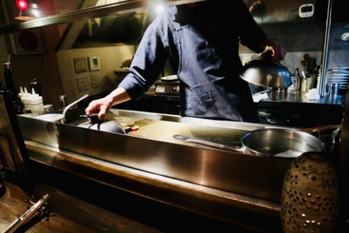 お料理はカウンターの前の鉄板で作られます。手際の良さに惚れ惚れしながらお食事が出来るので、カウンターは最高の場所です。