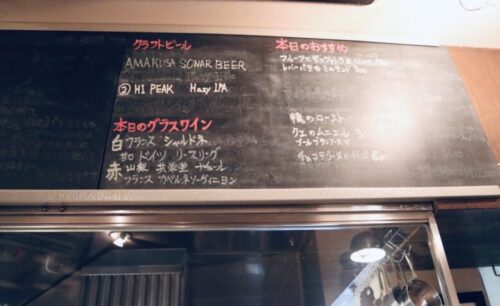 頭上の黒板には本日のオススメ料理などが書かれております。お次は、レバーパテのミニサンド。