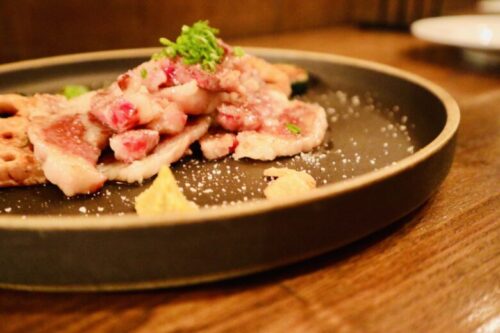 お次はお肉料理。これも迷いに迷って、馬ヒモの炙り焼きにしました。一瞬ザクロのように見えます馬ヒモとは馬の中落ちカルビのことだそう。