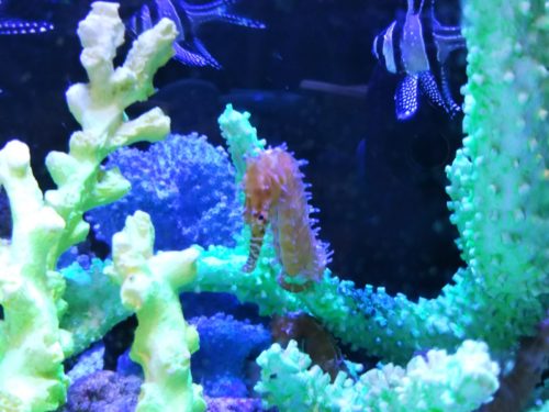 きれいな水槽の中にはタツノオトシゴも。気分は水族館です。