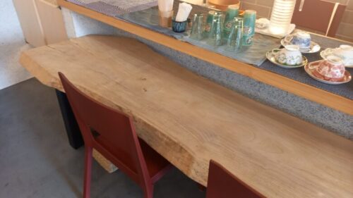 木の存在感たっぷりなテーブルが2席。