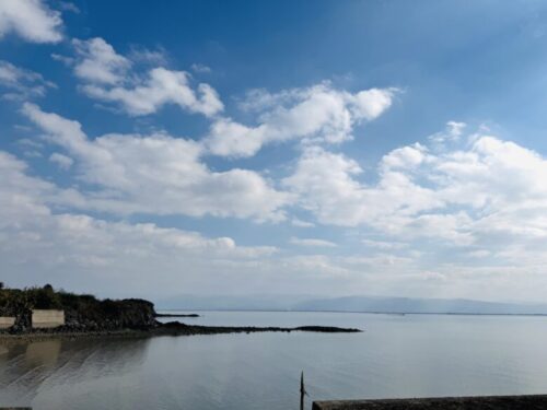 熊本市内中心部から車でおよそ1時間20分程。海を見ながらドライブ。