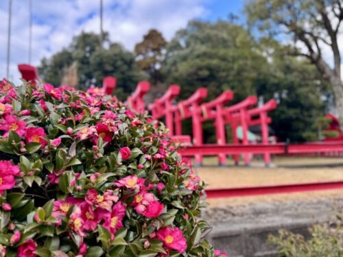 ずらりと並んだ真っ赤な鳥居。周りには椿の花が咲いており、ここだけものすごくカラフルな空間となっておりました。
