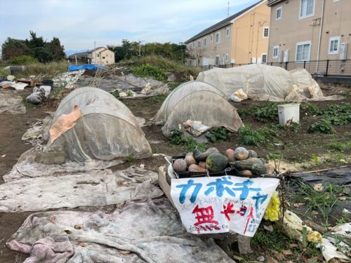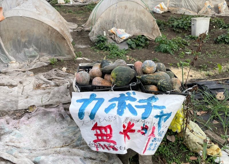 実は、畑のそばにお店があり、生活費の足しに、畑でできた野菜を販売されているそうで、お店に置けない形の悪い物を、無料で提供されているとのこと。ハロウィーン前の10月29日は、20個近く、かぼちゃのお持ち帰りがあったようです。