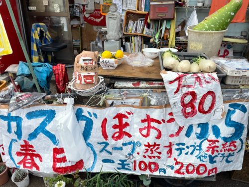 春日ぼうぶらのPOPもすべて手書きで、「スープ、蒸す、天ぷら他どうぞ」と、美味しい食べ方の紹介も…。貯金箱も置いてあり、福島さんご夫妻がいらっしゃらない時は、無人販売で、貯金箱にお金を入れて購入しても大丈夫とのこと。