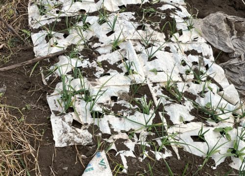 わけぎも、肥料袋をマルチ替わりにして、ハサミで穴が開けられていたり…お金をかけないスタイルが素敵です。