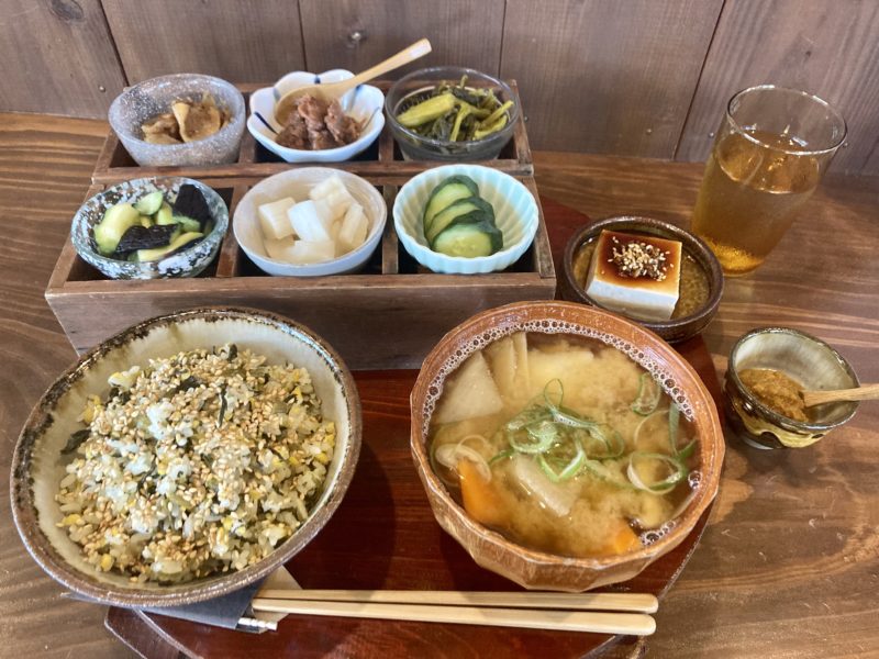 メニューは、おつけもの昼膳1品のみ。ご飯は高菜飯に変更可能で、漬物は日替わりで旬の6種類の味を楽しめます。だご汁の味も選ぶことができて、デザート・お茶も付くので十分満足できます。