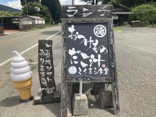 高森町上色見、国道265号線を走行していると、ランチ“おつけもの・だご汁“、さらに”ご当地ソフトあります“と書かれた看板があります。