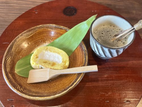 食後には、きんかん入りのロールケーキに、ほうじ茶が出てきました。デザートは、季節や月ごとに変わるそうです!