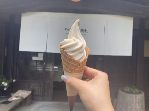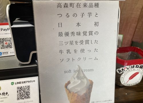 つるのこ芋とは高森町の在来種の里芋のこと。阿蘇市一の宮町坂梨にある「木村とうふ店」の豆乳とブレンドさせたソフトクリームで、日本初の最優秀味覚賞を受賞した阿部牧場の牛乳を使用しているそう。