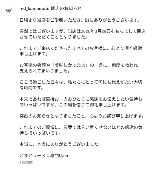 国道57号線、通称東バイパス沿いにあった「とまとラーメン専門店red」が2026年3月29日をもって閉店していました…。