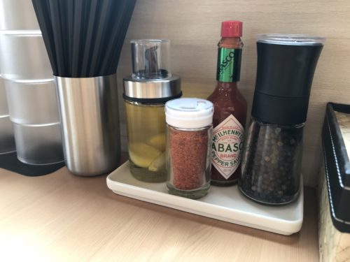 テーブルにはタバスコやニンニクの入ったオリーブオイルなどの調味料が置いてあり、お好みでラーメンに加えることもできます。