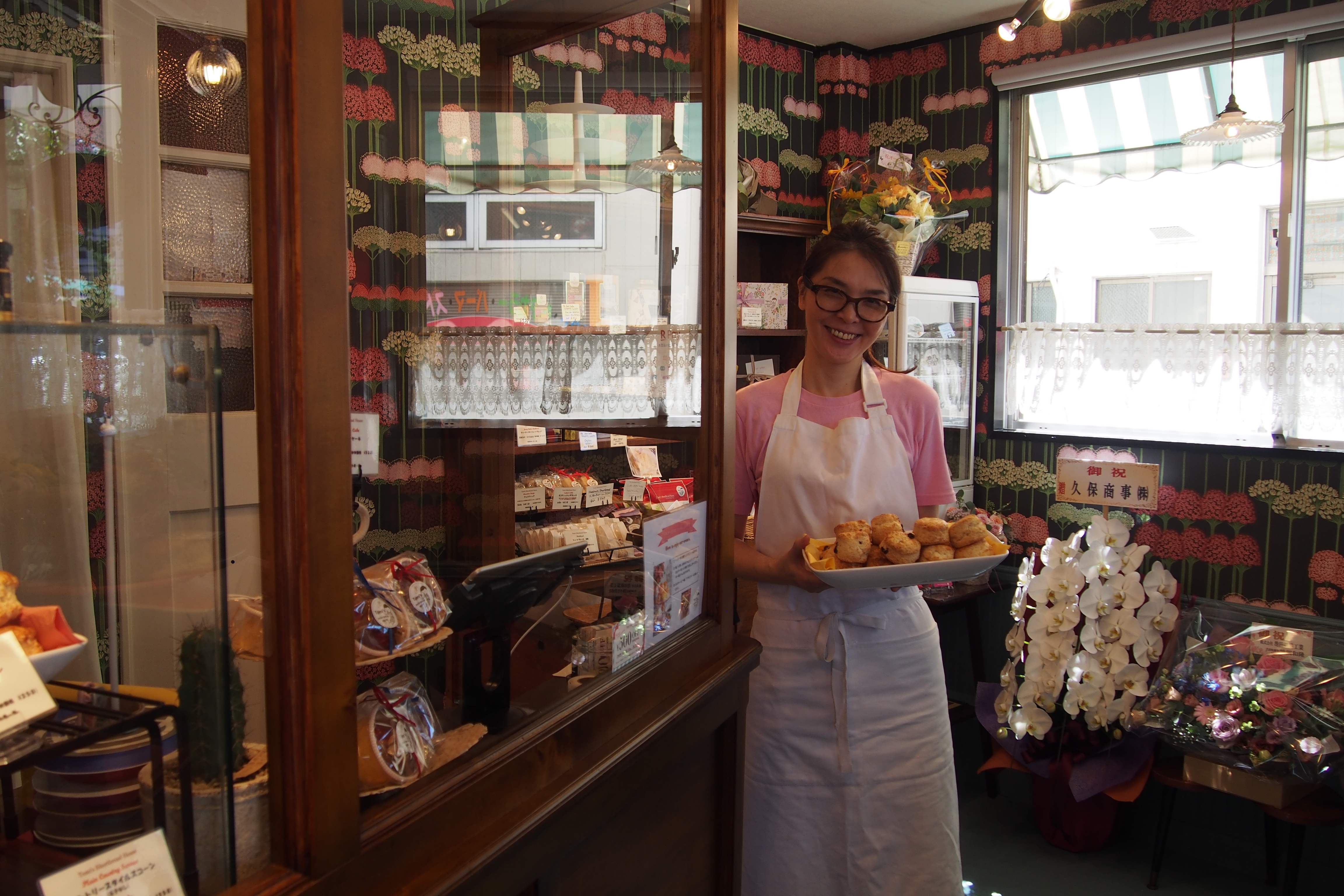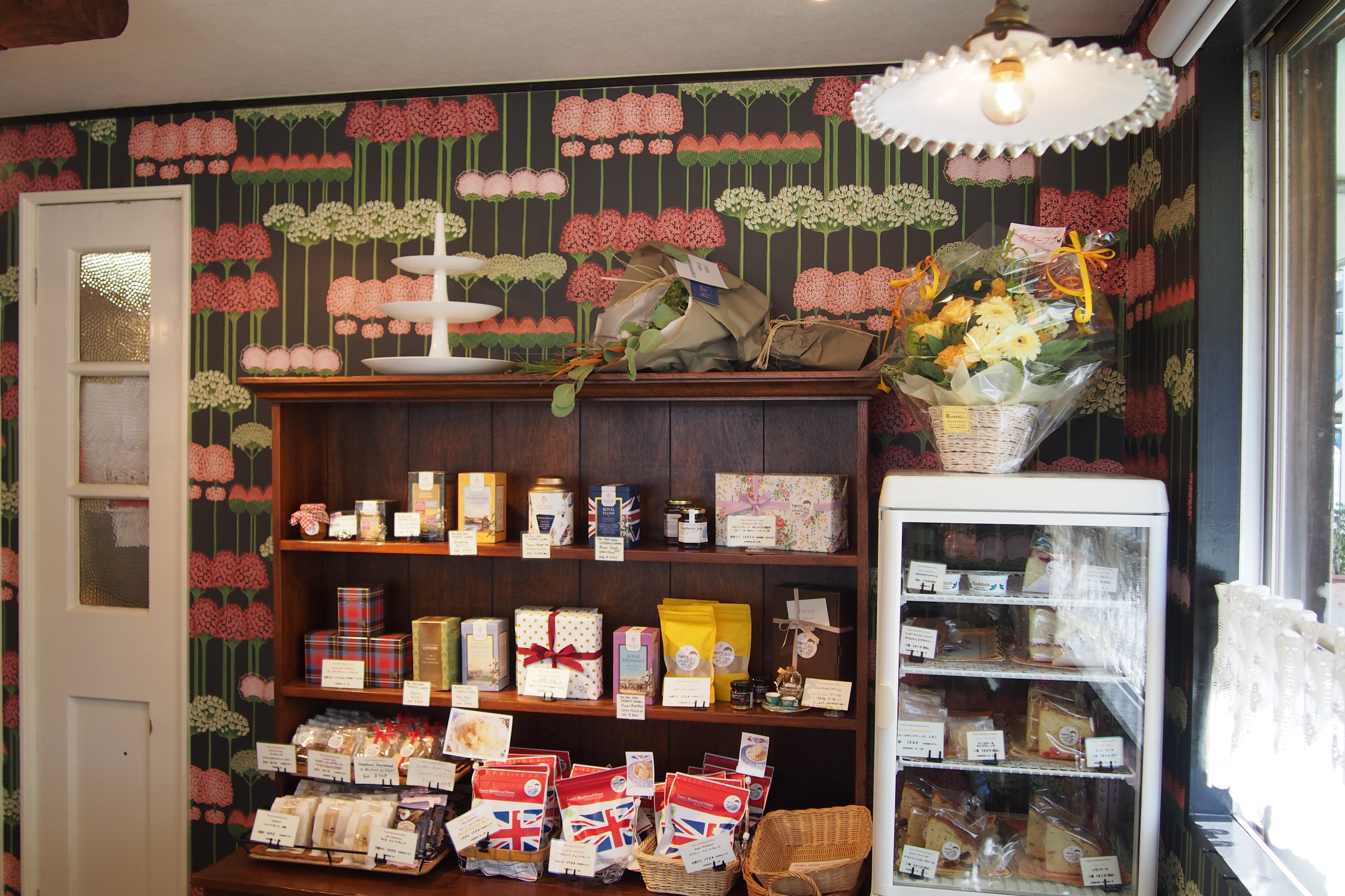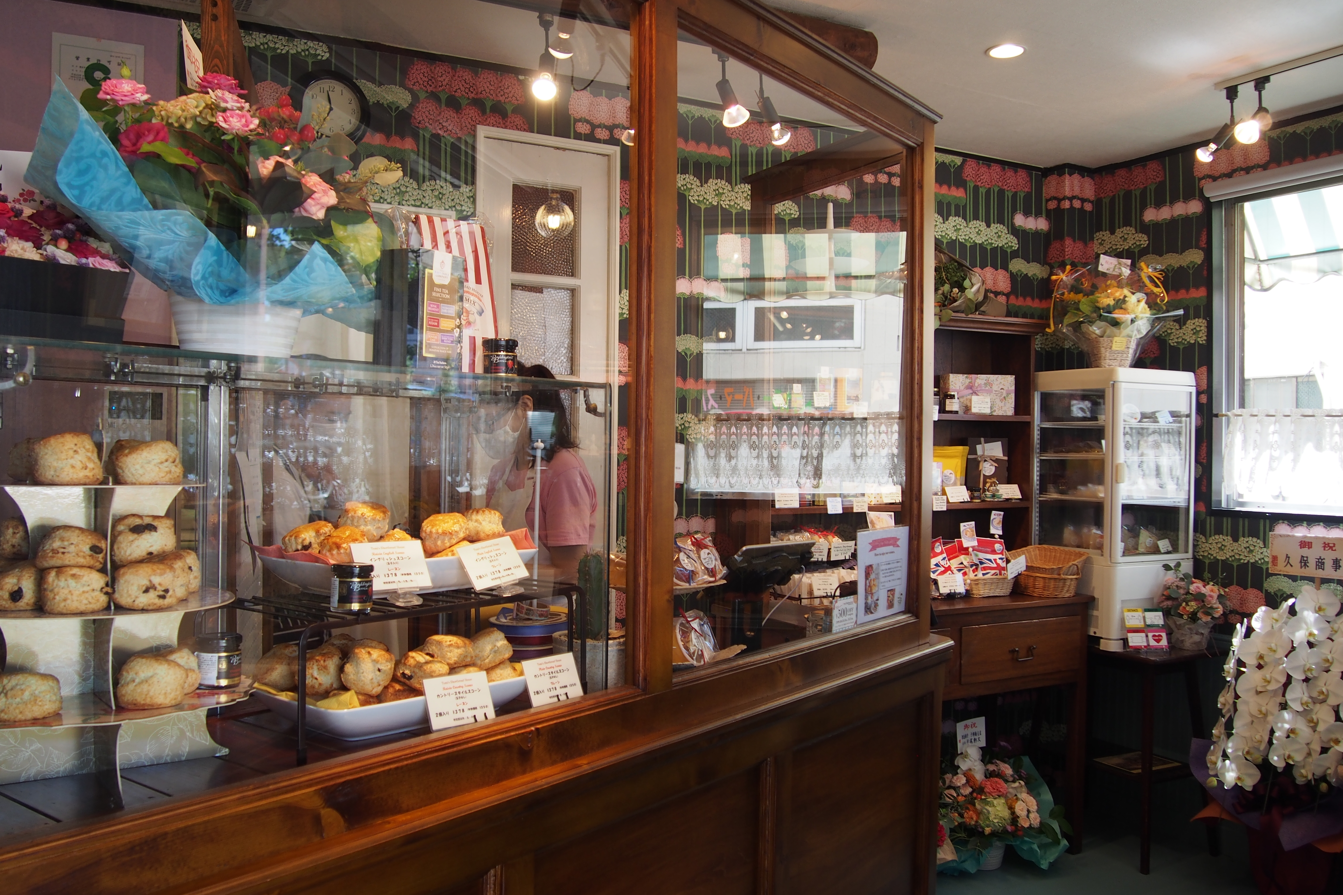 店内は、お花をモチーフにした壁紙のクロスと水色のフローリングや腰板に、品のある木製のショーケースがイギリスを彷彿とさせる雰囲気です。海外旅行にも行きづらい今、なんだかイギリスに訪れたかのような気分を味わえると喜んでくださるお客様もいらっしゃるんだとか。