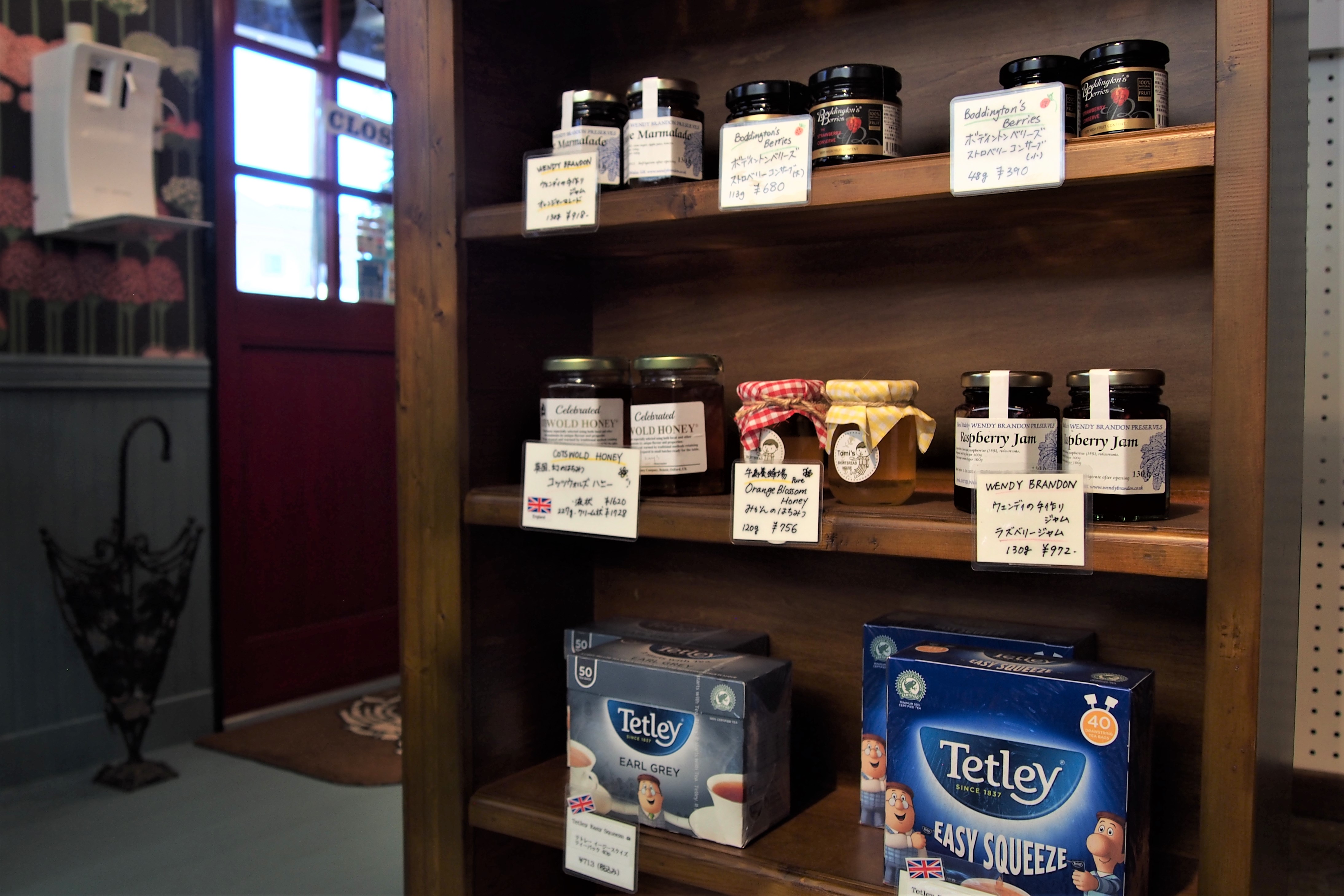 店内には、お菓子の他にもアフタヌーンティーには欠かせない紅茶やジャム・はちみつ等も販売されています。