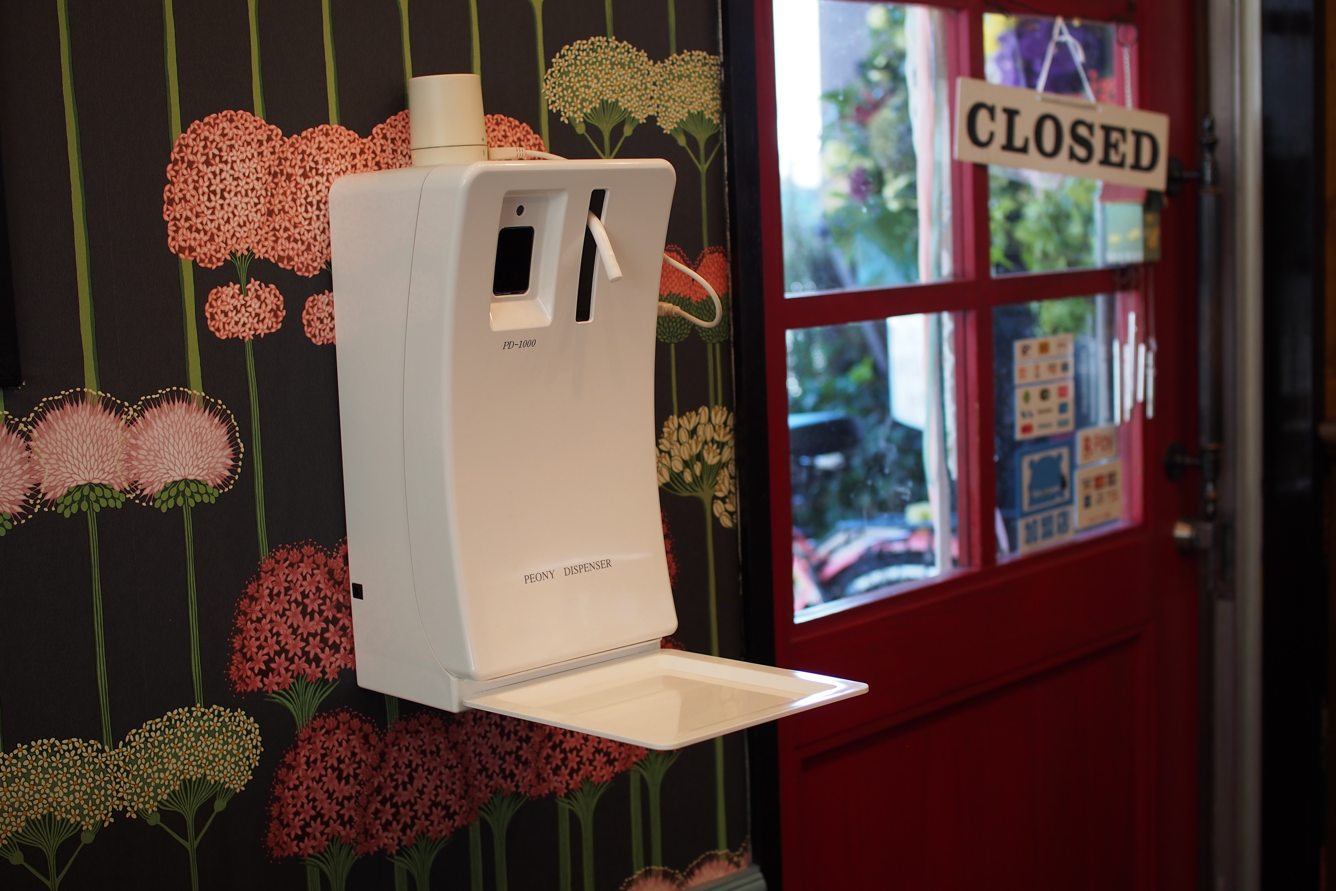 まずは、入り口に設置されたセンサー付きの消毒のご利用をお願いします。