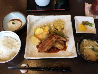 メインは、「白身魚のみそチーズフライ 自家製トマトソース」を選んでみました。白身魚のほかに、ナス、オクラ、ズッキーニ、じゃがいも、オクラ、かぼちゃ、ヤングコーンのフライまでついてきて、ボリュームたっぷり!