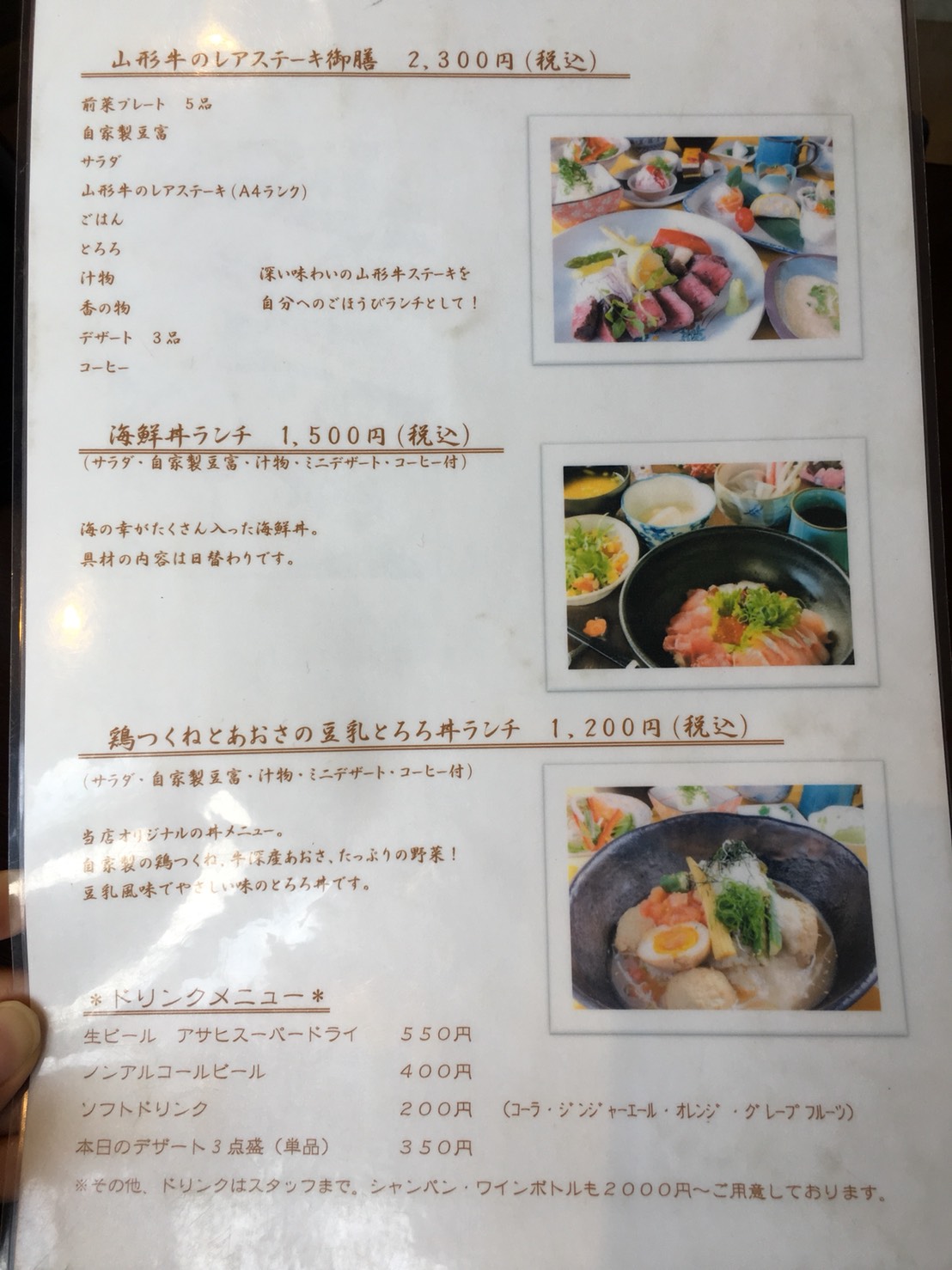 ほかにも、山形牛のレアステーキ御膳や、海鮮丼ランチ、鶏つくねとあおさの豆乳とろろ丼ランチなどもあります。