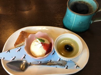 おまちかねのデザートは、りんごのチーズケーキ、アイスクリーム、抹茶プリンの3種類。一度に3種類のデザートが食せるなんて贅沢です!しっとりしたケーキも、濃厚なバニラアイスも、つるんとさわやかな抹茶プリンも、どれもおいしく、食後のコーヒーとともに幸せを味わいました。