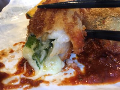 白身魚を切ってみると、なだれるほどたっぷりのチーズと大葉!白身魚はしっとり、チーズはとろとろで、自家製トマトソースとのマッチングも最高!とろろまでついてきて、ご飯はおかわり自由というサービスも素敵です。