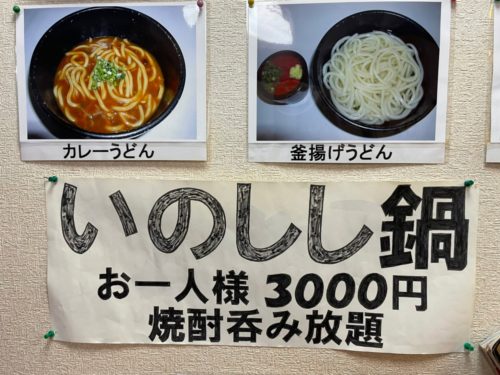 さらにいのしし鍋(6月ぐらい迄)は、お一人様3,000円で焼酎飲み放題までついてくるという気前の良さ!ちなみにこちらの飲み放題は、時間無制限だそうで、閉店までゆっくり飲むのも良さそうです。