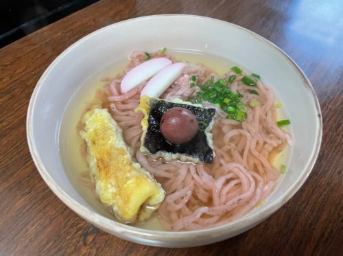 麺の中に梅干しとシソが練りこまれた、ヘルシーで赤く美しいうどんです。