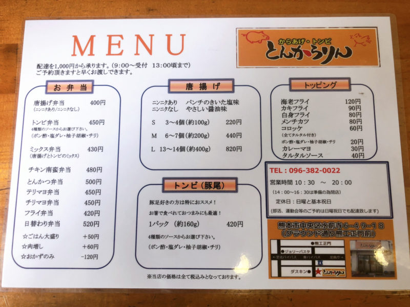 メニューはお弁当9種類と、からあげがサイズ別に3種類、ここにもトンビ(豚尾)の文字