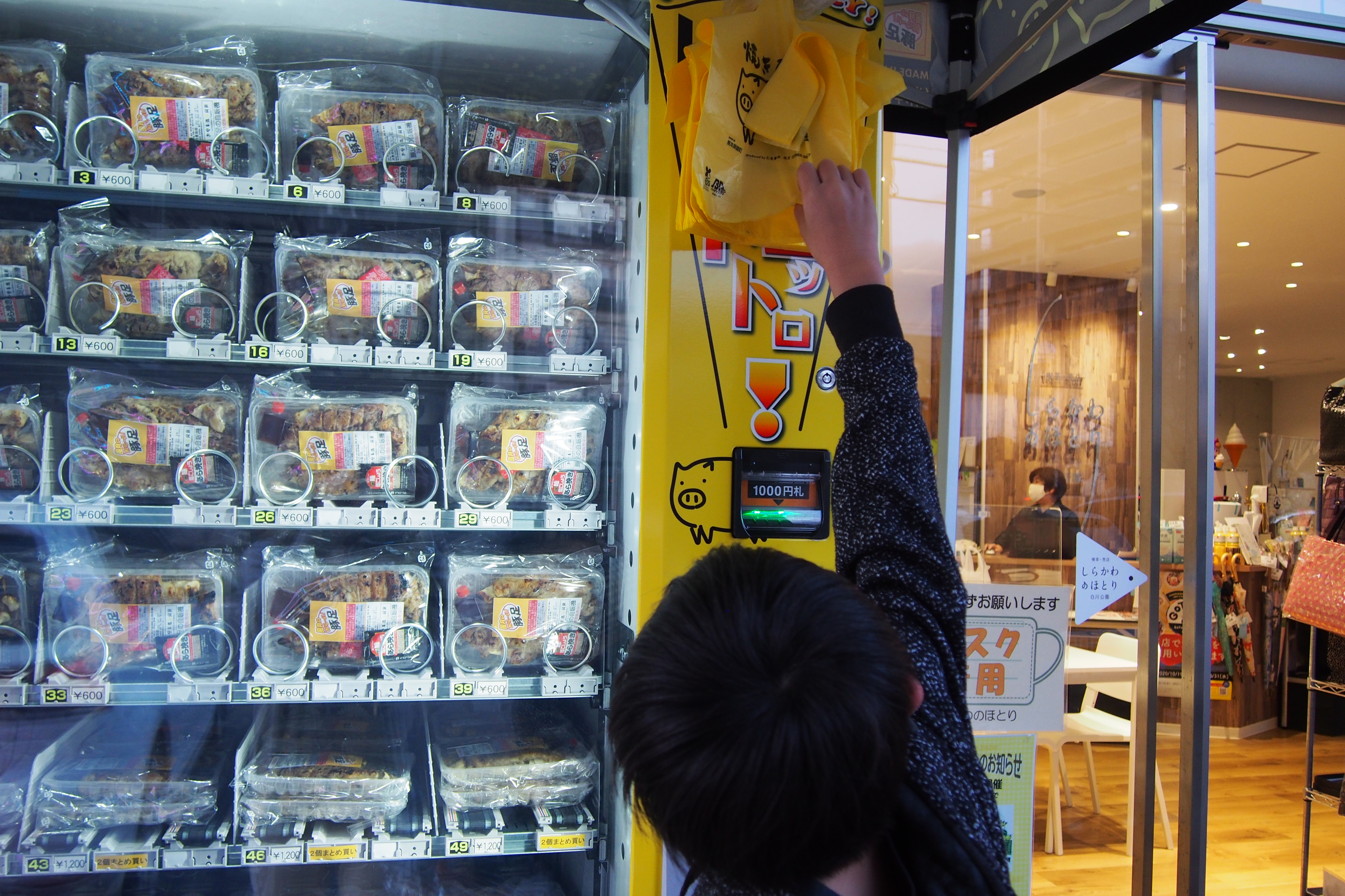 自販機の上部には、お持ち帰り用の袋も用意してあります。小学生でも届く高さなので、ご近所の方はお子さんのおつかいにも良いかもしれませんね。