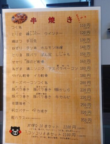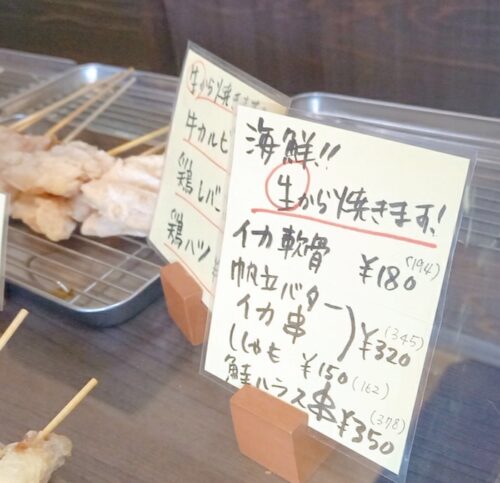 豚のど軟骨(172円)などの希少部位、生から焼く海鮮やホルモン系の串も充実。