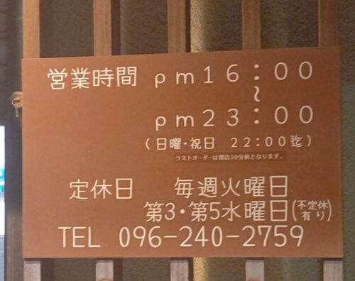 | 営業時間 | 月・水~土曜 16:00~23:00(ラストオーダー22:30) 日・祝日 16:00~22:00(ラストオーダー21:30) ※売り切れ閉店あり |