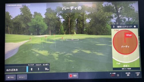 パターのシミュレーションがないため、最後はアプローチが命運を分けます。前のショットがピンに近ければ近いほど円が広がってバーディーやパーが取りやすくなる仕組みです。シミュレーションラウンドをすると、アプローチショットの機会が増えるため強制的に100ヤード内の練習ができてオススメです。
