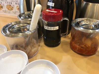 「天丼用のタレ」がテーブルに置いてありますので、タレの追加をお好みで振りかけることができます。