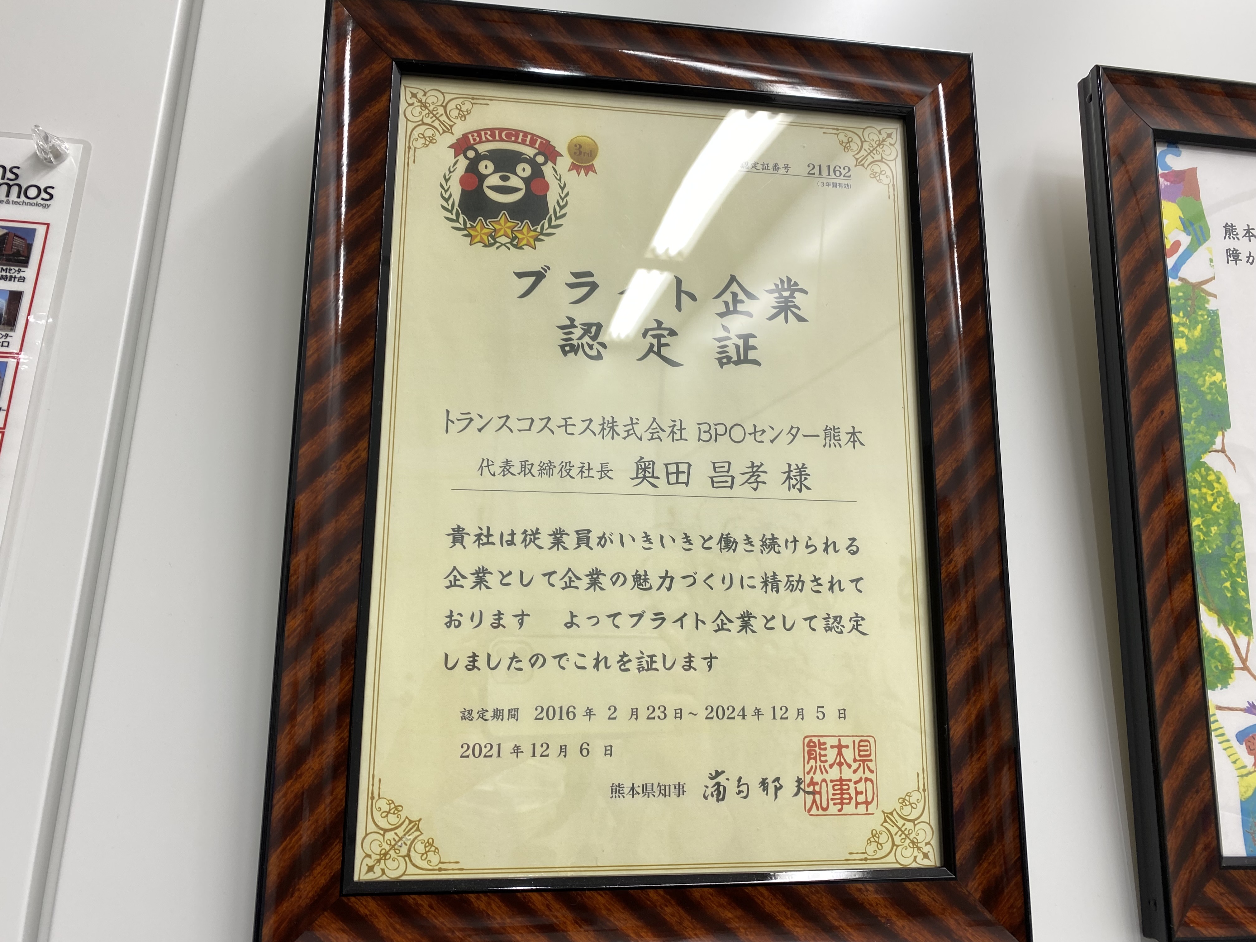 その中でも熊本県から「あなたの会社、働いている人が輝いているね!!素晴らしいよ!!」って認定を受けた