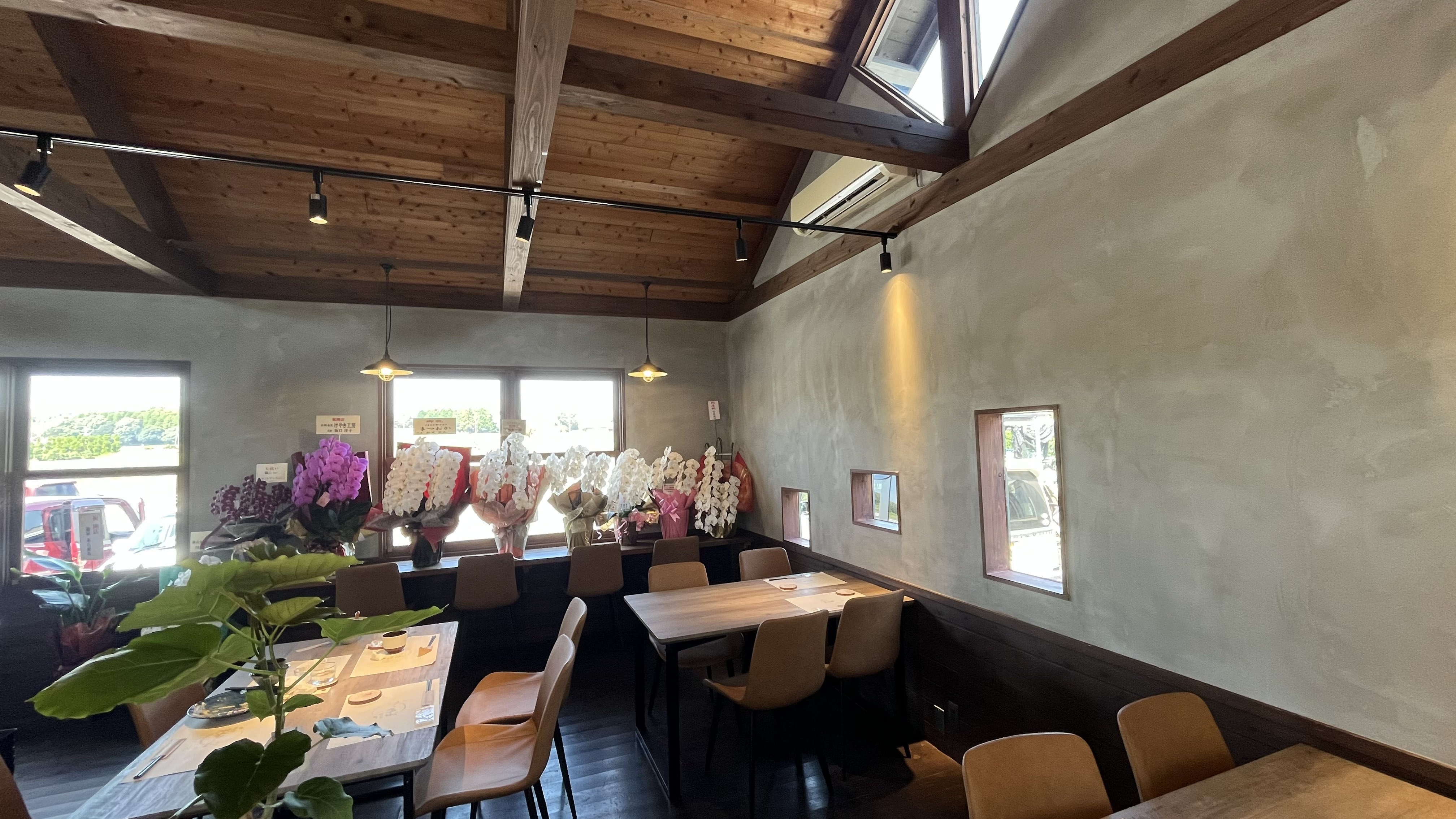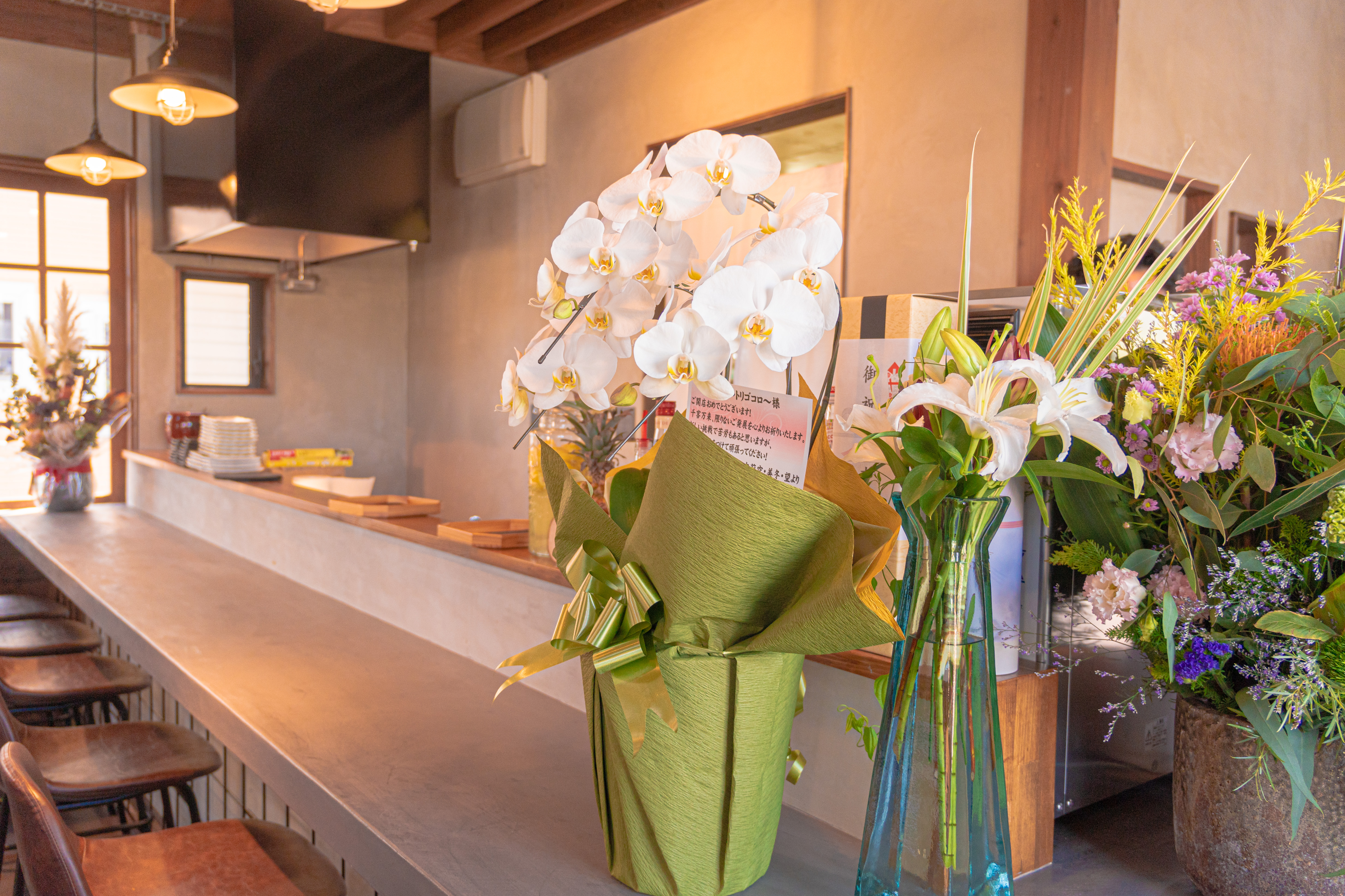 オープンした当日に来店したので、開店祝いとして胡蝶蘭がたくさん飾られていました。