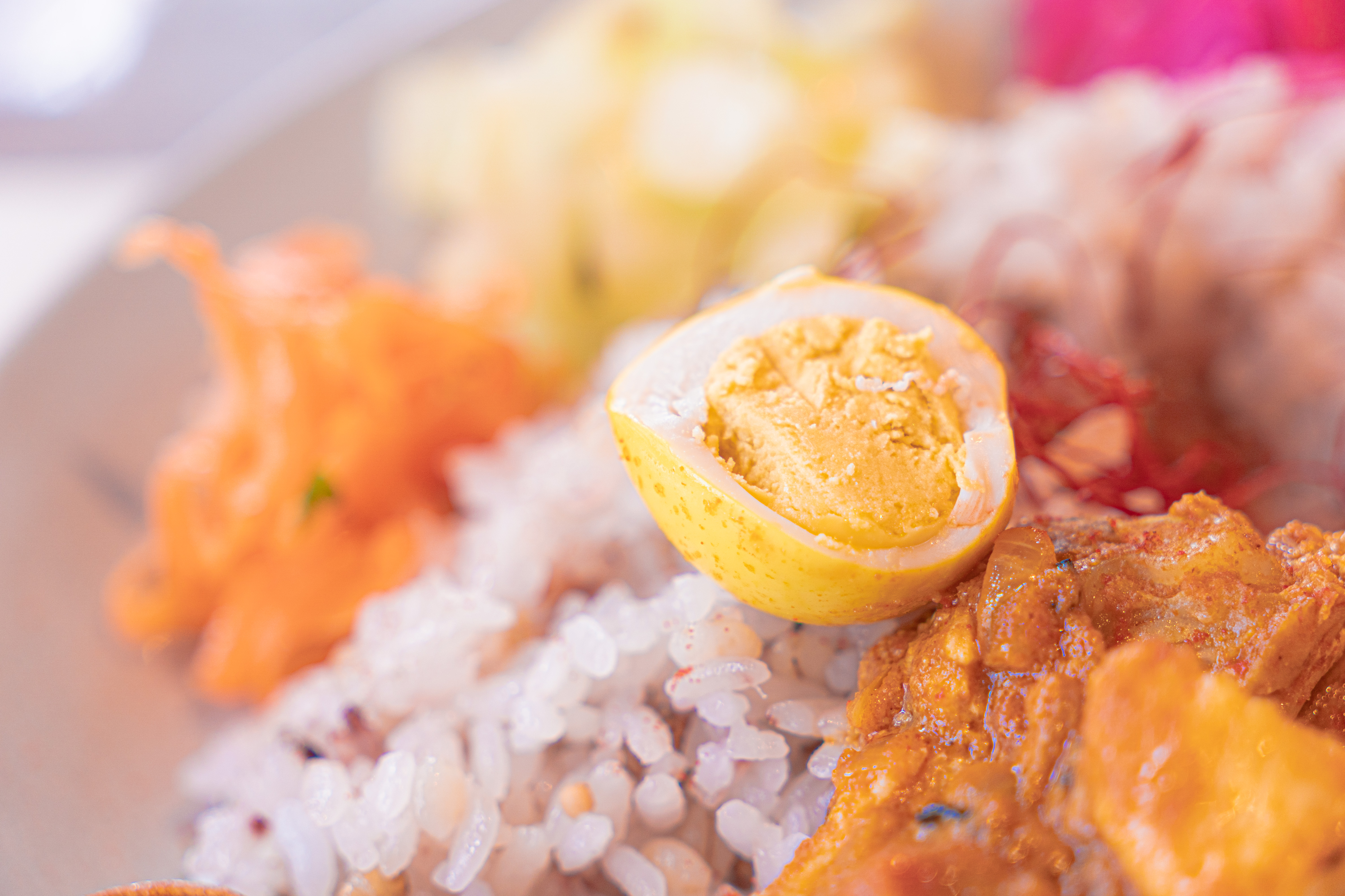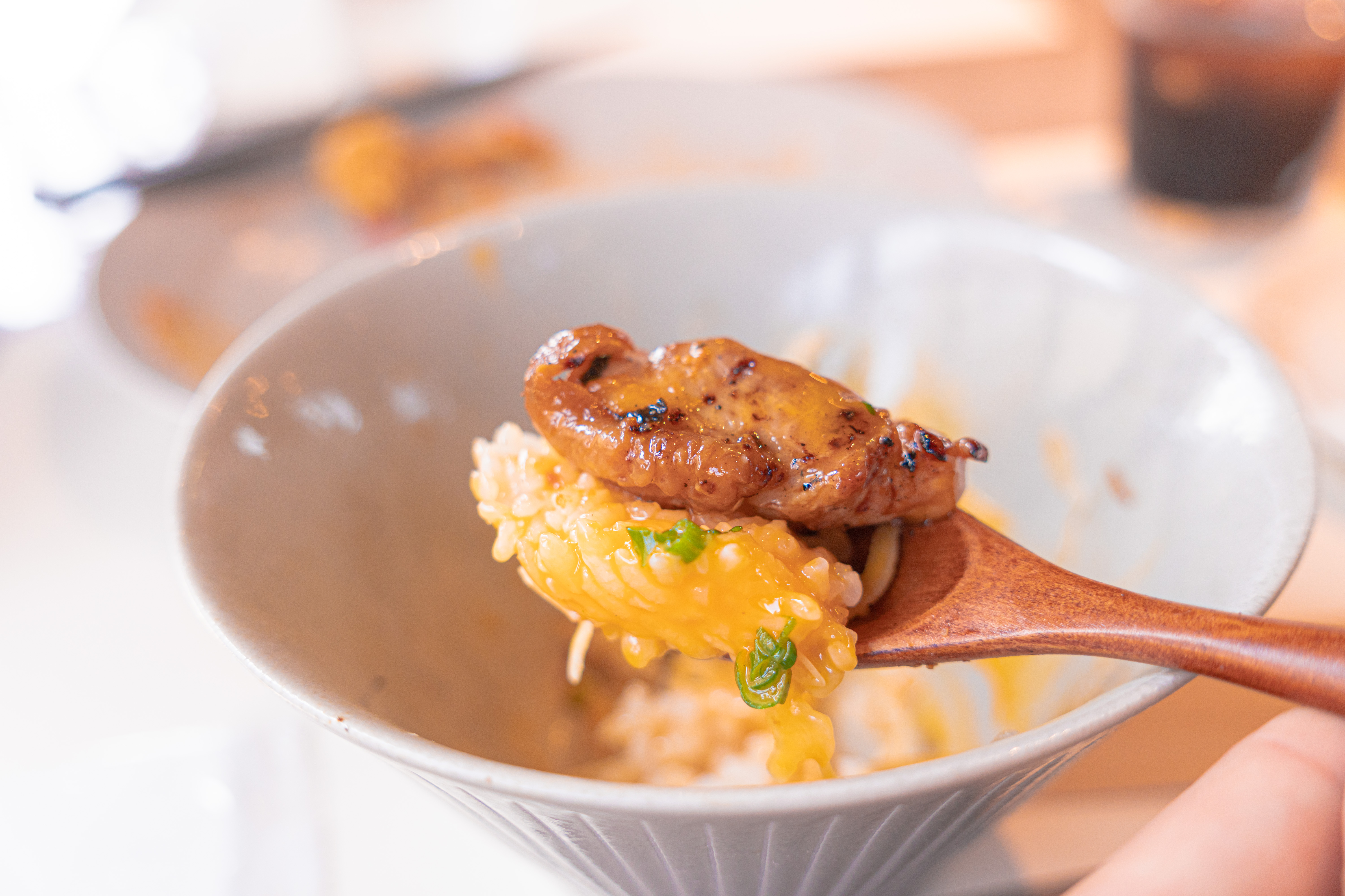 加えて丼の真ん中にある卵黄。スプーンの上ですくってみたんですが、これまたツヤツヤしているんですよね。