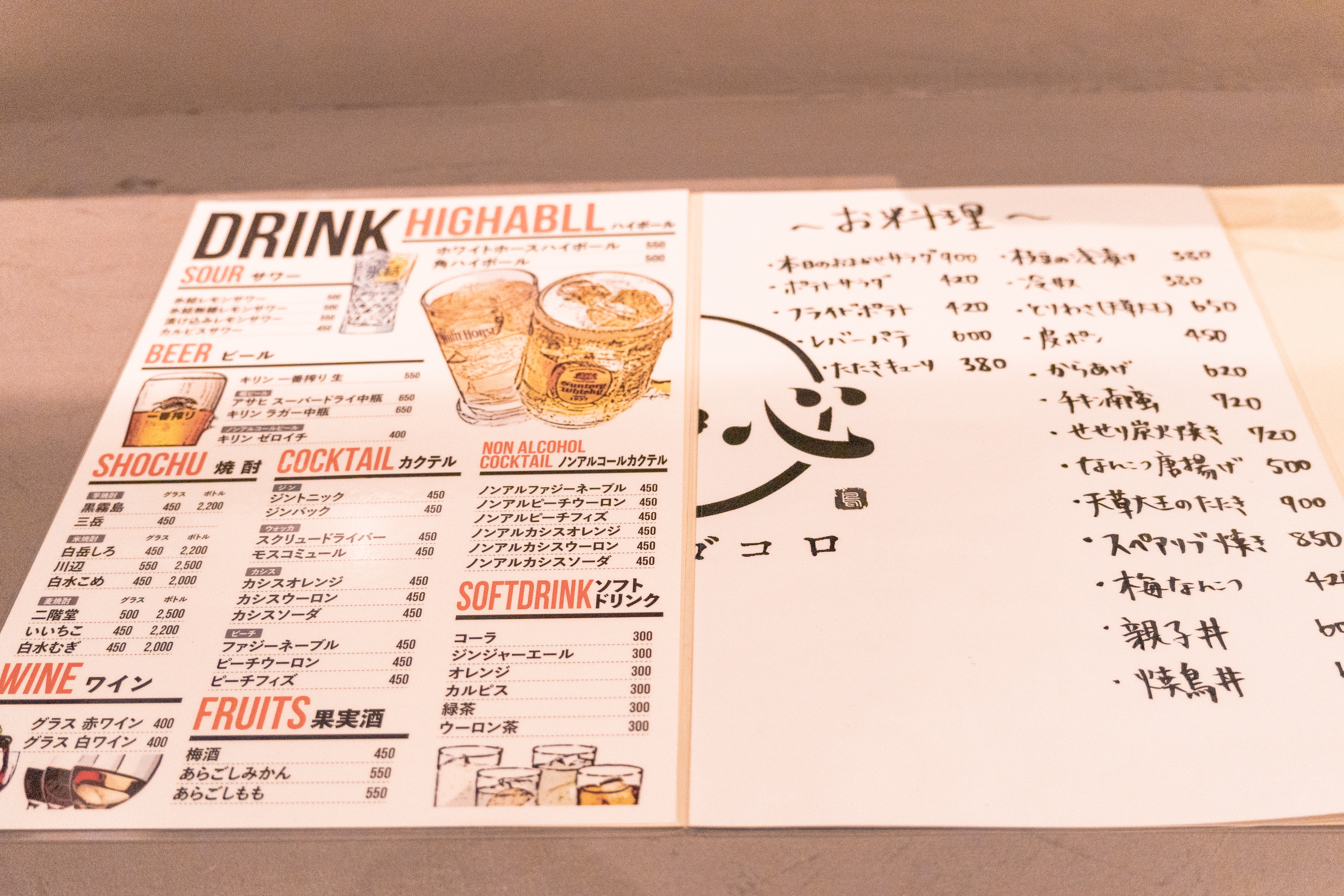 ランチの時と比べてガラッと変わる夜営業時のメニュー。居酒屋らしいラインナップが揃ってます。