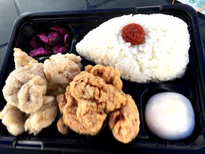 一個が大きな唐揚げが塩・醤油と3個ずつで計6個も!そのままでも十分味付けがしっかりしていますが、マヨネーズを付けると濃厚な味わいになります。ご飯も量も半端ではなく、盛り上がって蓋が締めにくい!初めからほぼご飯大盛り状態です!