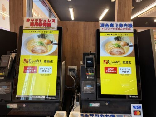 入口はいってすぐあるのは券売機。現金なのかキャッシュレスなのかで使用する券売機が変わりますので、見落とさないようご注意ください。