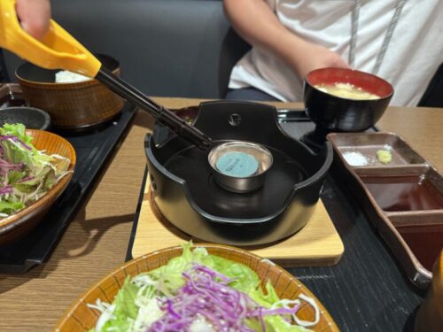 実はこの段階ではまだハンバーグは生焼けの状態。目の前で固形燃料を着火し、好みの焼き加減に自分自身で育て上げるスタイルです。