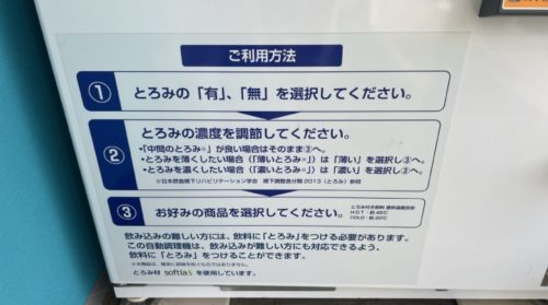 ちなみに同じ自動販売機でとろみなしのドリンクも購入できますので、