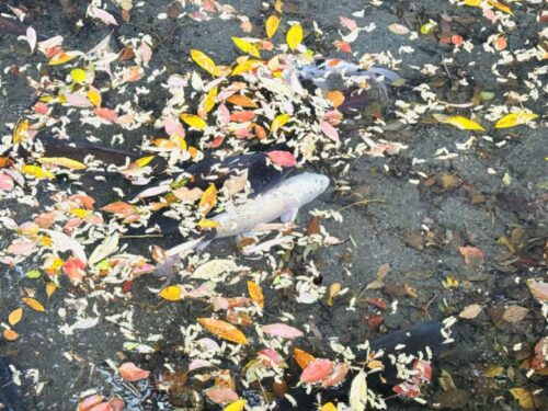 カラフルな落ち葉、白い鯉。まるで絵画のようなシーンに心を奪われます。