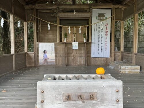 お賽銭箱の上に果物が置いてあり、心があたたかくなりました。