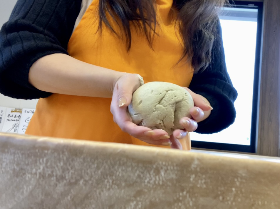 2人前分のそば粉にお水を数回に分けて入れ、混ぜていきます。マンツーマンで指導してくださるお姉さまにアドバイスを頂きながらそば粉が固まるまで混ぜて潰してこねて。