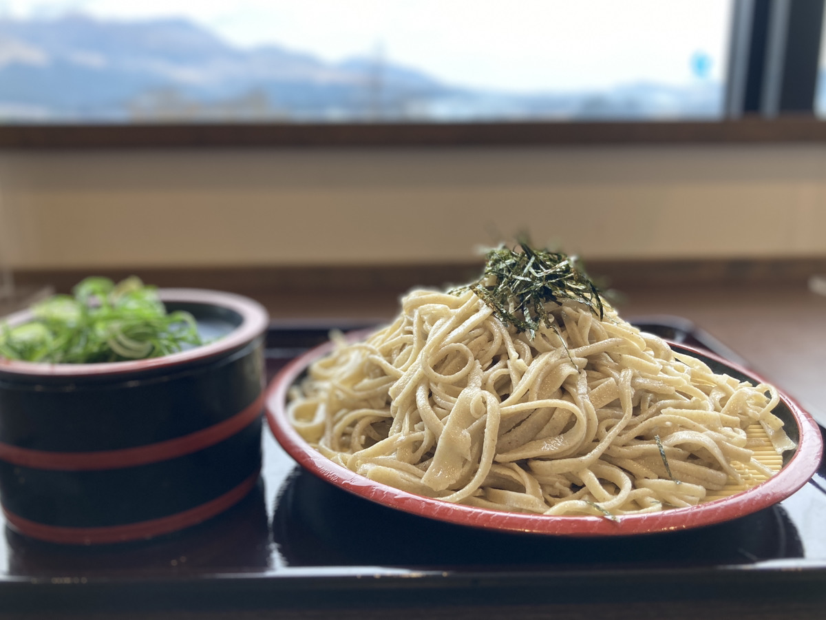 出来た蕎麦をその場で実食。体験の隣のスペースはレストランで、景色が見える開放的な席がおすすめ。